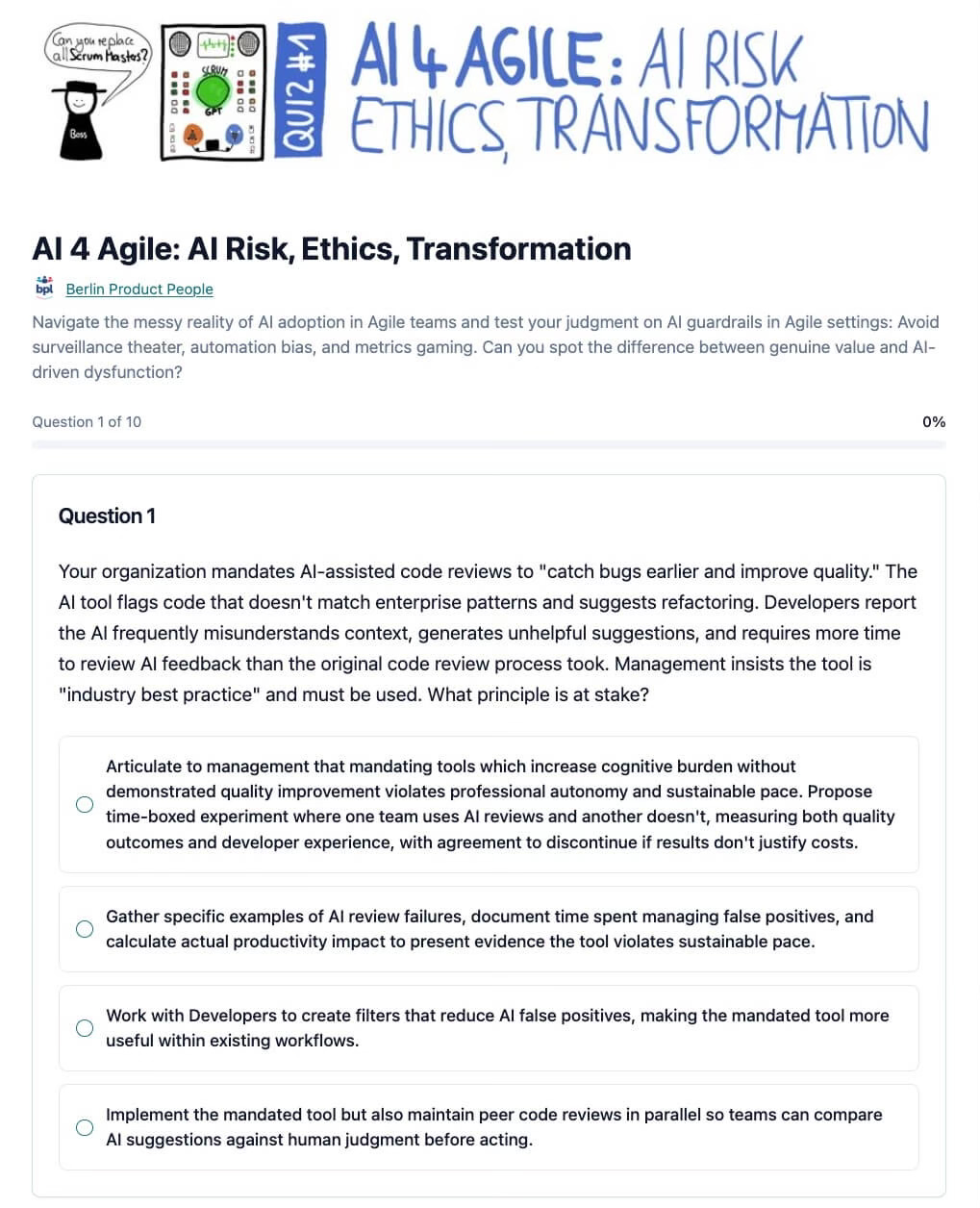 AI 4 Agile Quiz: AI Risk, Ethics, Transformation: Navigate the messy reality of AI adoption in Agile teams and test your judgment on AI guardrails in Agile settings: Avoid surveillance theater, automation bias, and metrics gaming. Can you spot the difference between genuine value and AI-driven dysfunction?